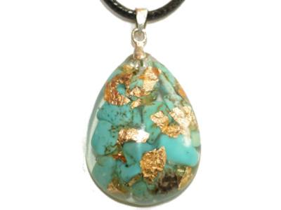Magnifique pendentif de création artisanale Orgonite goutte composé de Cristaux naturels de turquoise, et de feuilles d'Or 22 Carats.